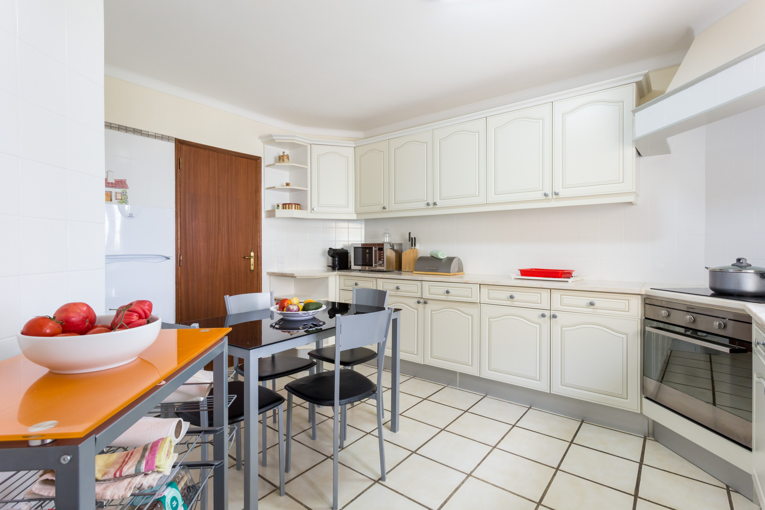 👩🍳 Uma cozinha totalmente equipada com forno, fogão, micro-ondas, máquina de lavar louça, frigorífico-congelador, torradeira, máquina de café e uma pequena mesa de pequeno-almoço
